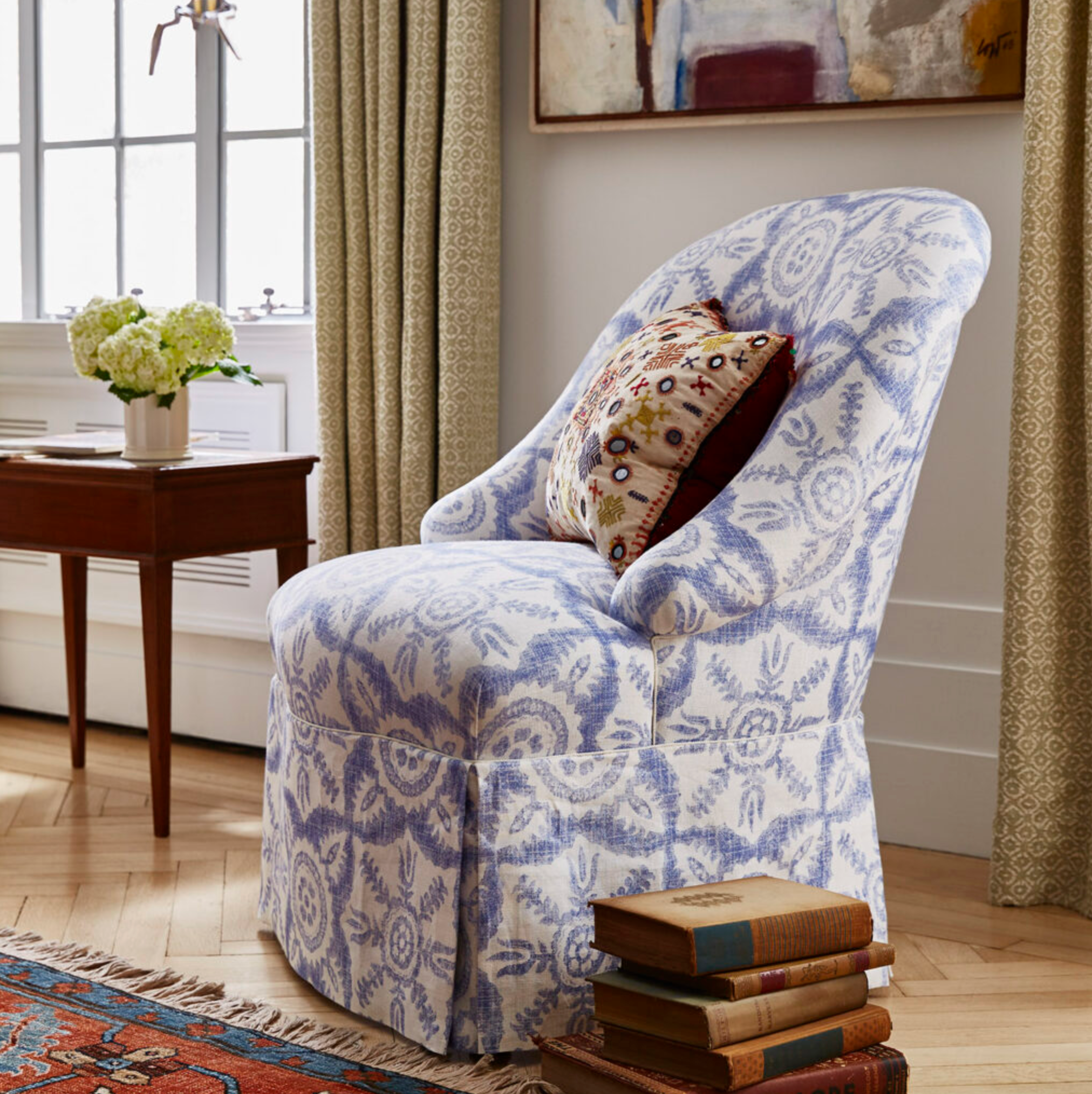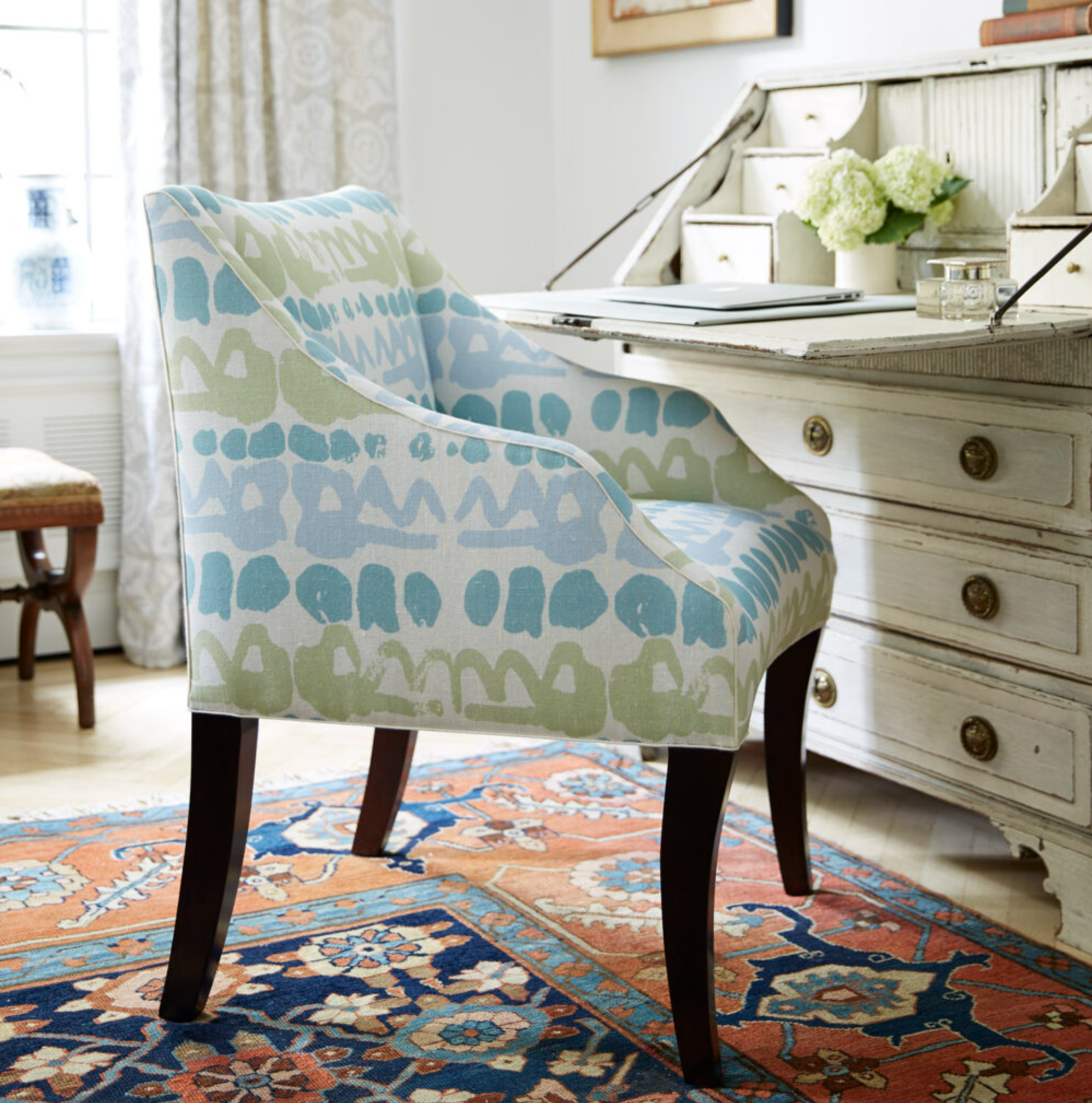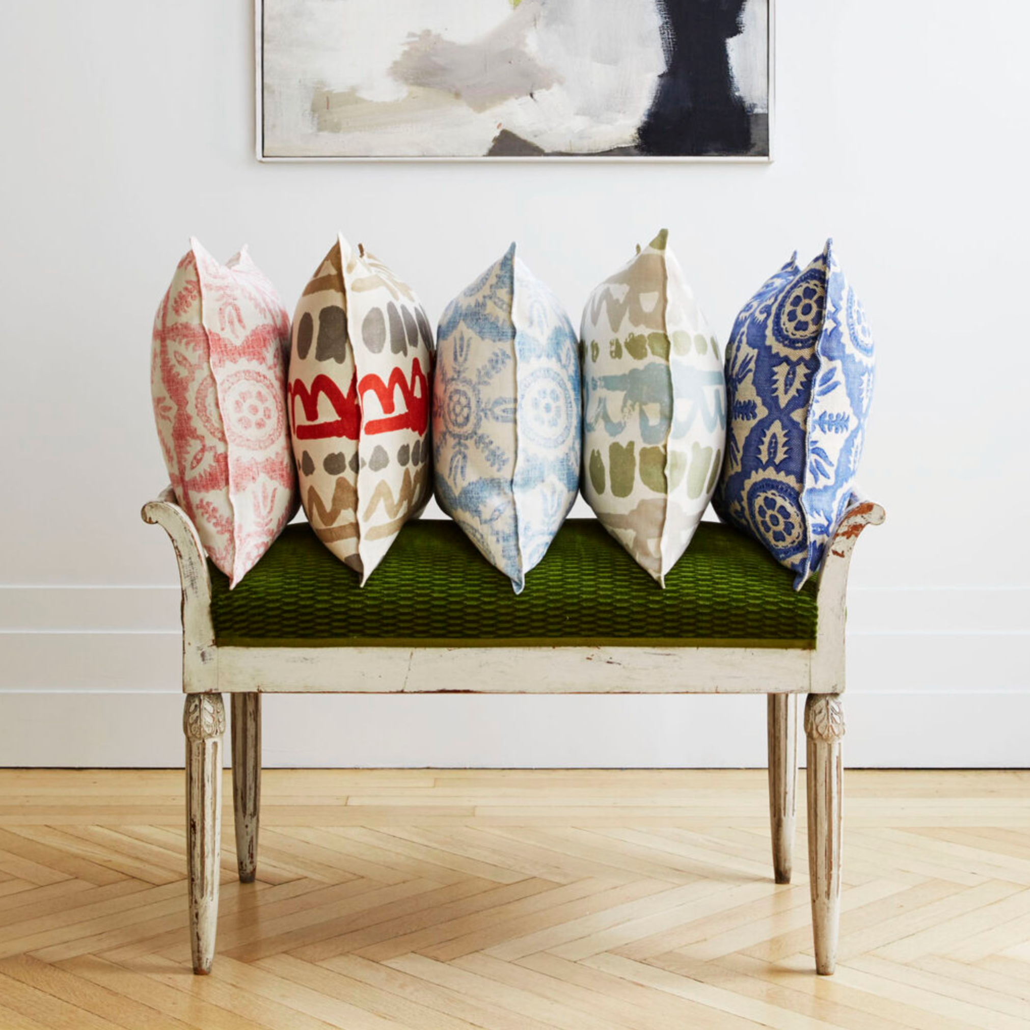 The Chatham collection brings together pared back colour and intricate design. At the centre of the collection is bold Altamira, an abstract print inspired by Spanish Palaeolithic cave drawings. It sits alongside classic designs Rossmore and Rossmore II and two Peggy Angus designs – Cornstooks, reminiscent of wheat sheaths and taken from the original lino blocks, and geometric Diamond, a careful reproduction of a classic Peggy Angus creation.